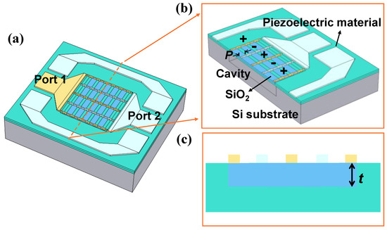 FEM simulation of an XBAR with LiNbO3 composite material was also carried out to demonstrate tuning of the . As illustrated in Figure 3a, the XBAR consisted of a suspended 300 nm-thick LiNbO3 composite platelet and a set of 100 nm-thick Mo electrodes on top. The electrical potentials were alternatingly applied to adjacent electrodes, as illustrated by the “+” and “−” signs in Figure 3b, creating a lateral electric field along the X axis. Due to the strong piezoelectric coefficient of LiNbO3, the alternating lateral electric field could excite vertical shear vibration in A1 mode within the platelet [19]. Structural optimization was implemented by adjusting the P of the SiO2 embedded in the thin LiNbO3 film within a range from 0 to 15 µm, while the thickness of SiO2 (t) remained 150 nm, as shown in Figure 3c.