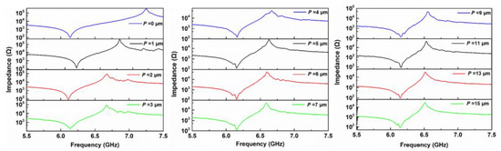 The impedance curves of XBARs with different widths of nonpiezoelectric materials (P) ranging from 0 to 15 µm.