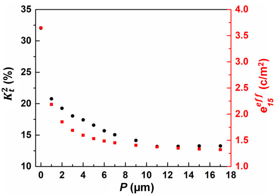As shown in Figure 5, when P increased to 1 µm, decreased sharply from 32% to 20.7%, and then declined slowly with the increase in P from 2 to 11 µm. When P increased beyond 11 µm, no longer changed. The variation trend of is highly consistent with the change in the calculated effective piezoelectric coefficient , which demonstrates that introducing other materials to a LiNbO3 piezoelectric matrix is an effective method for tuning the of XBARs.