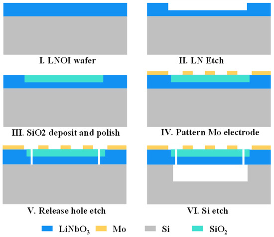 Here, we provide a possible fabrication process flow for our devices, as shown in Figure 6. The substrate wafer consists of a thin Z-cut LiNbO3 film and a Si substrate. Firstly, the thin LiNbO3 film is etched via electron beam lithography; the depth is controlled by the etching time. A 150 nm-thick layer of SiO2 is deposited on the surface of the LiNbO3 film and then polished to a smooth plate. Then, molybdenum (Mo) electrodes are deposited on the surface of the thin SiO2/LiNbO3 film and patterned by lithography and reactive ion etching technology. Subsequently, the release holes are realized via electron beam lithography, which enables formation of the cavity by removing the Si substrate with Xef2. By exactly controlling the release time, resonators with only a suspended working area are realized.