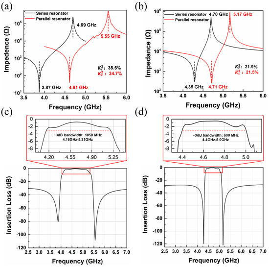 (a) The impedance curves of an XBAR with pure LiNbO3 film for the n79 filter. (b) The impedance curves of an XBAR with SiO2/LiNbO3 composite film for the n79 filter. (c) The response of the proposed filter with pure LiNbO3 film. (d) The response of the proposed filter with SiO2/LiNbO3 composite film.