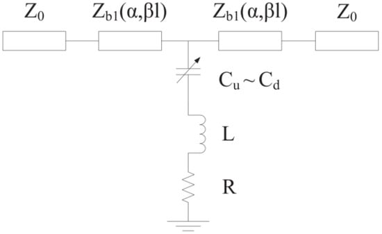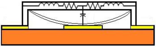 A common MEMS parallel switch beam is connected between the transmission line and ground, and the switch anchor is connected to the CPW ground. Figure 2 shows the equivalent model of the switch in operation, wherein the beam mainly produces inductance, and the beam with the transmission line and the middle of the dielectric produces the capacitor. When the DC voltage is applied between the MEMS beam and the CPW transmission line, the resulting electrostatic force causes the beam to bend downward and switches to the down-state. When the DC bias voltage is not applied, the beam returns to the initial state (up-state) by the elastic restoring force. Figure 3 shows the circuit topology of the typical MEMS switch.