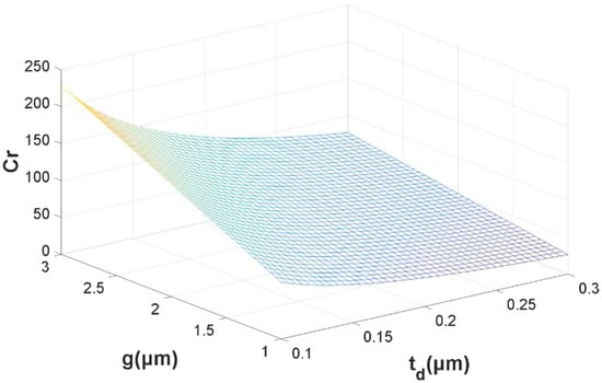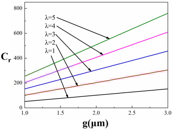 Figure 6 shows the relationship between the parameters of g, Cr and λ, when k = 20 N/m, td = 0.15 μm and εr = 7.6. It has been discovered that Cr increases with the increase of λ and g.