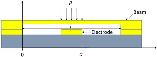 where the spring constant is the spring constant caused by the stiffness of the beam, is the spring constant caused by biaxial residual stress of the beam, is the uniformly distributed load of the beam, is the tensile force of biaxial residual stress, is biaxial residual stress, is the Possion ratio, is the Young’s modulus, l is the length of the beam, w is the width of the beam, and t is the thickness of the beam.