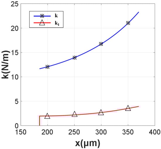 Figure 8 depicts the relationship between the spring constant and the electrode coordinates. From Figure 8, we can observe that, as the area of the electrode decreases, the spring constant decreases. For the rectangle beam with Au (E = 78 Gpa, v = 0.44), the length of the beam is 370 μm, the width of the beam is 160 μm, the thickness of the beam is 1 μm, (the gap between beam and CPW) is 2 μm and .