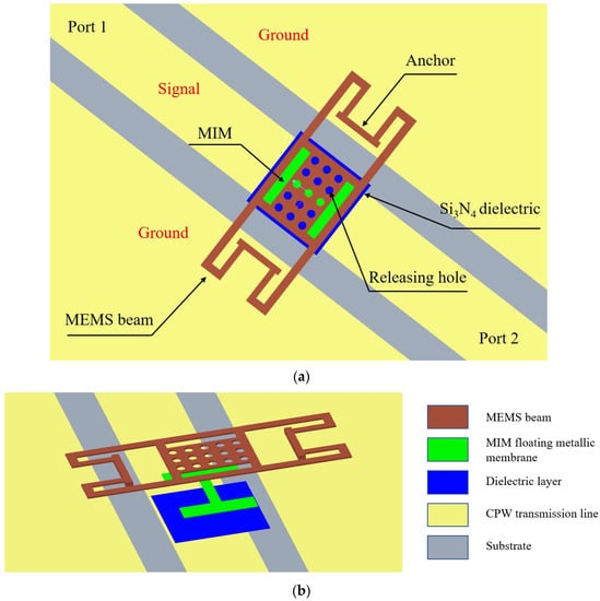 The proposed high capacitance ratio MEMS switch is shown in Figure 10a,b. It includes a serpentine flexure MEMS metallic beam, metal–insulator–metal (MIM) floating metallic membrane, dielectric layer and a CPW transmission line.