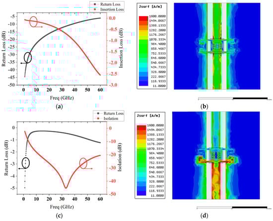 Simulated S parameters and current distribution diagrams: (a,b) up-state; (c,d) down-state.