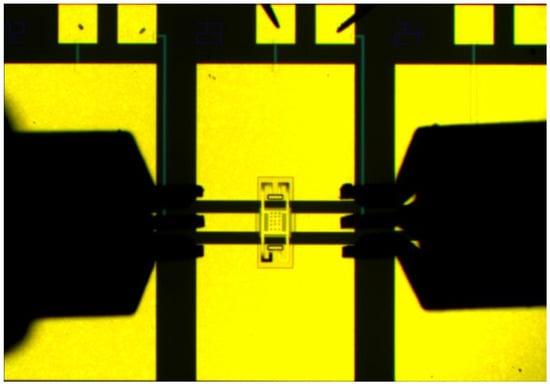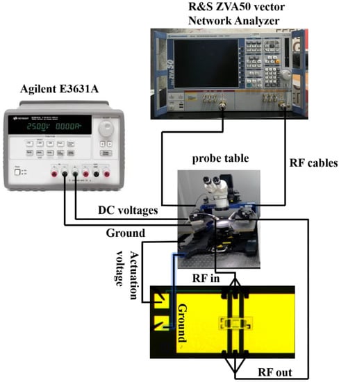 The measurements were conducted in an ultraclean room. The temperature and relative humidity of the measurement environment were 24 °C and 40%, respectively. An Agilent E3631A provided the DC voltages. The S (S11 and S21) characteristics of the RF MEMS switch were measured using a vector Network Analyzer (R&S ZVA50, Rohde & Schwarz, Munich, Germany). To contact the two ends of the switch, two gold ACP-A-GSG-150 probes (Cascade Microtech, Beaverton, OR, USA) were utilized, and the device was put on a probe table (Cascade Summit 11000B-M, Cascade Microtech, Beaverton, OR, USA). The sweep frequency ranged between 10 MHz and 40 GHz. Figure 14 shows the RF measurement setup of the switch.
