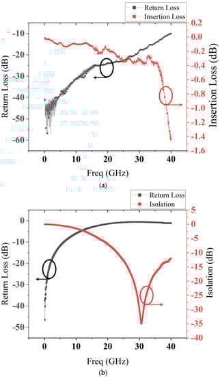 The measured results show that the insertion loss is better than 0.5 dB at 32 GHz, and the isolation is more than 35 dB at the resonant frequency in the range of 25–35 GHz. Compared with simulated results in Figure 12a,c, the measured results match well with simulated results.