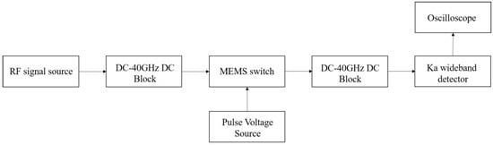 The RF MEMS switch is placed on the microwave probe table, and the CPW transmission line port is connected to the RF signal generator and Ka band wideband detector respectively through the GSG microwave probe and the microwave coaxial line. It should be noted that when the CPW transmission line is used as the DC bias electrode of the switch, a DC ~40 GHz block needs to be added to prevent the DC signal from entering the signal generator and detector. The oscilloscope is used to observe and record the pull in and release time of MEMS switch.
