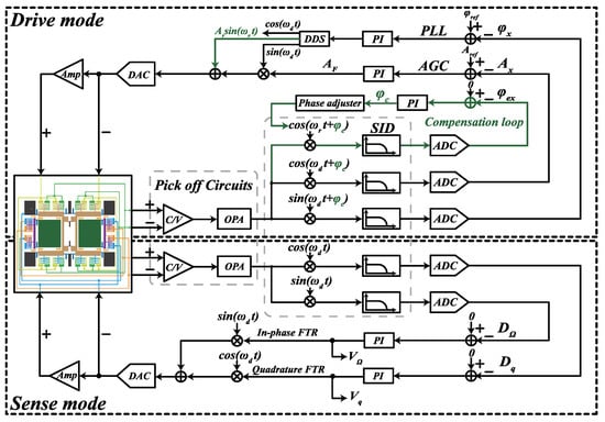 In the drive mode, the PLL makes the driving frequency ω d track resonant frequency ω x and the AGC keeps the amplitude of the displacement A x at the reference amplitude A r e f . The demodulation reference and feedback force signals are originated by the Direct Digital Synthesis (DDS). The phase compensation loop is applied for adjusting the initial phase of the demodulation reference, and the details are introduced in Section 4. In the sense mode, the output signals are modulated by sin ω d t and cos ω d t to generate the two feedback forces V Ω sin ω d t and V q cos ω d t by the PI controller under the double-loop FTR control, which keeps the sense mode relatively static. The output of the PI controller in the in-phase and quadrature loop are the angular velocity signal and quadrature error signal, respectively.