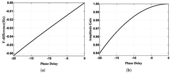 Equation (6) shows that the existence of phase delay directly causes the gyroscope to be in a nonresonant state since the phase shift φ x * in the resonator is not 90 ° , which consequently affects the control accuracy. Besides, the research on the effect of phase delay in the drive mode is not mentioned in detail, so it is worth investigating the change of driving frequency ω d and amplitude gain A g due to the phase delay, because the driving frequency ω d is smaller than the resonant frequency ω x in the actual operating system. Substituting Equation (6) into Equation (5), we can obtain the relationship of the driving frequency and the phase delay error.