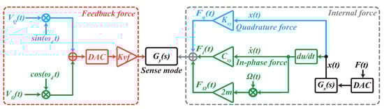 The resultant internal force in sense mode includes Coriolis force F Ω t , in-phase damping coupling force F i t and quadrature error force F q ( t ) , as suggested, respectively, in Equation (11).