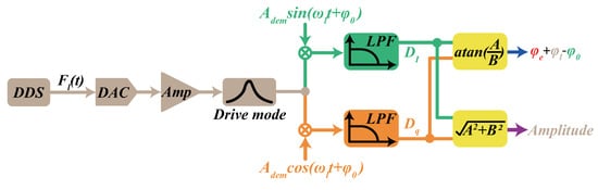 where A d and A r are the amplitude of the driving displacement and nonresonant displacement, φ x * and φ r * are the phase shift of driving force and nonresonant reference force through the resonator, respectively. After being demodulated by the demodulation signal cos ω r t + φ 0 , the output D φ e can be acquired according to Equation (19).