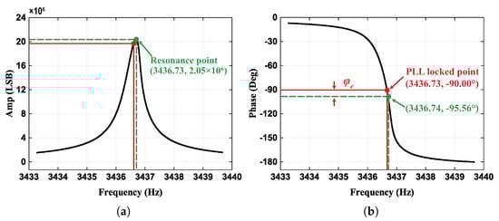 It is clear that the resonator is in a resonant state when A x reaches the maximum in Figure 5a, while the phase value φ a l l is not 90 ° but an offset exists due to the phase delay error in Figure 5b from the calculation results. According to the control principle of PLL, the phase value is controlled at 90 ° , thus the existence of the phase delay error will lead the gyroscope resonator to not be in a resonant state. Besides, based on the fact that the phase φ l equals 90 ° when the gyroscope is in resonant mode, the phase delay can be quantified by the phase frequency characteristic as: