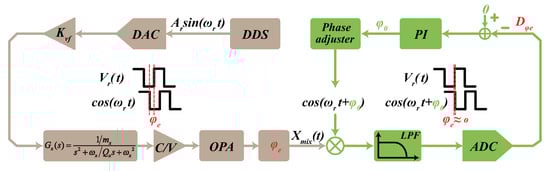 Sources of phase delay in the control system were demonstrated in detail in previous research [15,20,23]. Similarly, the complete loop phase delay φ e in the control system mentioned above can be divided into φ D A , φ A m p , φ C V , φ O P A , φ c o d e , which represent the phase delay of the DAC, the analog amplifier, CV convert circuit, OPA circuit, and the digital algorithm, respectively, that is, φ e = φ D A + φ A m p + φ C V + φ O P A + φ c o d e . Now, considering the phase delay φ e , the actual phase is as follows when in a resonant state.