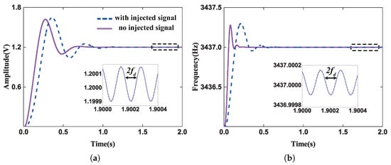 According to the principle of the compensation method, the feasibility of this method is that the nonresonant force does not affect the normal control in the drive mode. So the amplitude and frequency of the driving control signal are simulated before and after injecting the nonresonant reference force by Simulink. In order to keep the drive mode working in normal operation and not affect the bandwidth of the gyroscope, the nonresonant frequency was chosen to be 80 Hz higher than the driving mode natural frequency, and the cutoff frequency LPF in Figure 1 was lower than 80 Hz, which was applied to remove the frequency difference component. In this system, the cutoff frequency is designed to be 7 Hz. The simulation results are shown in Figure 8. Simulation results show that the injecting the reference signal would not affect the operation state of AGC and PLL owing to the low pass filter. The compensation loop and drive mode control loop were separated into their respective loops, and the double frequency component was far lower than the threshold of the control loop, so in the practical situation, this component can be ignored.