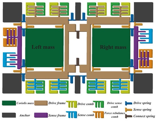 The main structure was composed of two symmetric single-mass gyroscopes, where the strings were used to connect the supporting frames and the effective mass, the anchors were applied to fix the resonator’s main structure to the glass substrate, the drive and force rebalance combs were used for exerting incentive and rebalance force, and drive sense and sense combs were used for detecting the displacements in drive and sense modes, respectively.