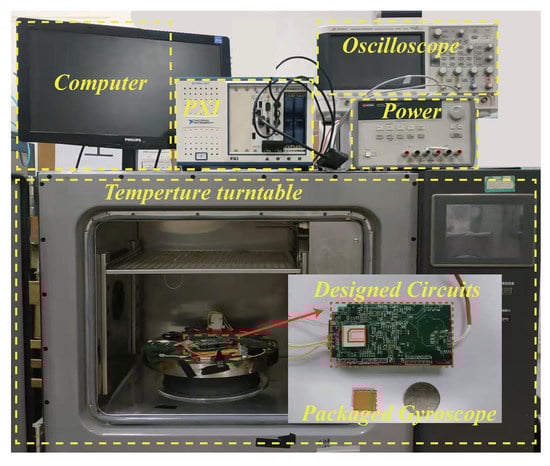 Figure 10 shows the test environment and control circuits. The packaged gyroscope and circuit were fixed on the angle turntable wrapped in the incubator, the angle turntable was used to provide the angular rate and the incubator was applied to change different temperatures respectively. A direct current (DC) power supply was utilized to provide power and ground for the control system, and the Peripheral Component Interconnect (PXI) was used to measure the frequency spectrum of signals. The computer was applied to collect the test data through the USART by the LabVIEW at a 1 Hz sampling frequency.