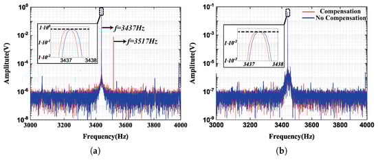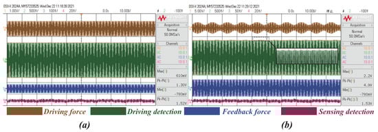 In Figure 12a, the driving displacement includes the resonance and nonresonant frequency component, which confirmed the detectability of the response of the reference signal. Besides, the amplitude of the resonant frequency component is equal before and after compensation, which shows that the nonresonant reference force would not affect the normal control of drive mode. In Figure 12b, the frequency spectrum of the feedback force signal in sense mode was matched identically in two situations, which demonstrated that the injecting signal would not affect the output of the gyroscope.
