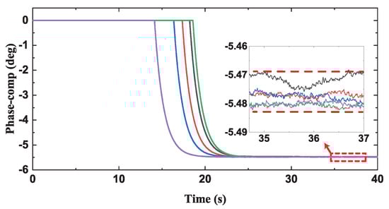 The process of the compensation was tested five times in Figure 13. The phase compensation loop started working 20 s after the drive mode was in a stable state, and the compensation phase value tended to be stable after about 10 seconds and continued working. Moreover, the deviation of the stable phase value in the five measurements was within 0.1°. The difference between the final compensation phase value and the phase error in Figure 5 is within 0.2%, which proved the accuracy of the compensation scheme.