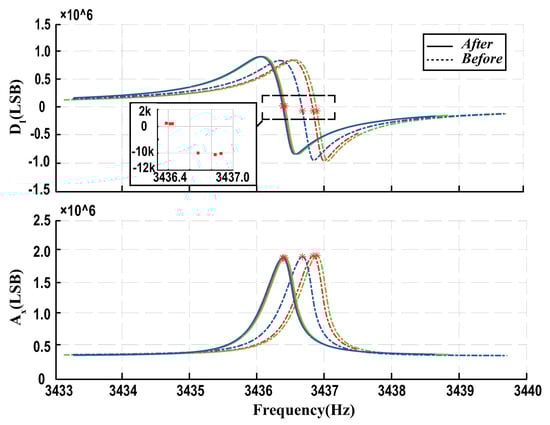In order to validate the accuracy and effectiveness of the proposed compensation method, the sweep frequency experiments were carried out on the digital control system as mentioned in Figure 4. The frequency response curves before and after compensation are shown in Figure 14, where D I and A x represent the digital quantity of the in-phase demodulation value and amplitude value. This can be easily seen by observing the residual in-phase demodulation value when the amplitude demodulation value reaches the maximum, and the residual offset introduced by the phase delay decreased by 98% from 100,000 LSB to 2000 LSB after compensation. The results demonstrated that the compensation scheme can remarkably eliminate the phase delay error, which makes the drive mode really work in the resonance state.