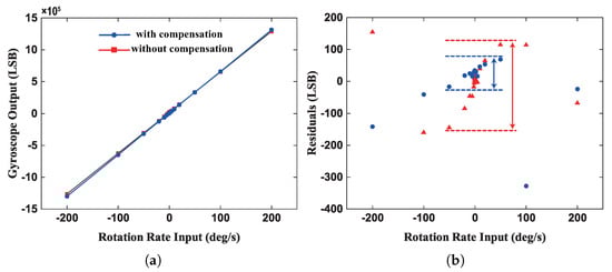 Figure 15. (a) Raw and compensated output of the gyroscope within ± 200 ° / s . (b) The residual error of the scale factor in both cases.