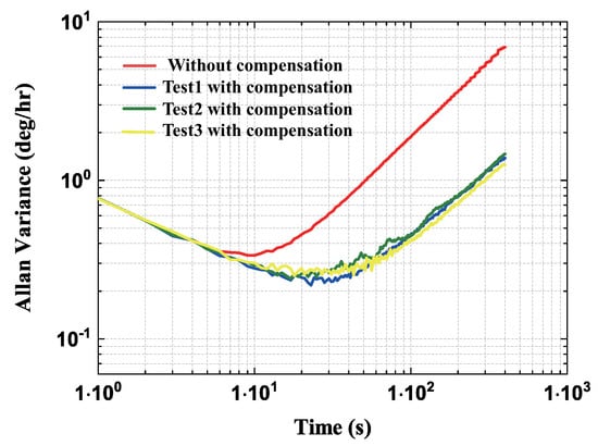 The ZRO of the gyroscope was recorded for 60mins by LabVIEW at room temperature, shown in Figure 16. The calculation results suggested that the bias stability (BS) and ZRO value are 23.301°/s and –0.717°/s before compensation, while the average of three tests of BS and ZB are 5.195°/h and –0.210°/s after compensation, which are improved by 3.41 times and 5.20 times, respectively. From the experimental data, the raw ZRO of gyroscopes was drifting because of a couple of quadrature errors, and the compensated ZRO were substantially reduced in both amplitude and drift values. In addition, the compensation data showed a great repetition in three tests. Our results demonstrated that the compensation can effectively offset the phase delay error and mitigate the leakage of quadrature error to the ZRO, which obtained the improvement in bias stability.