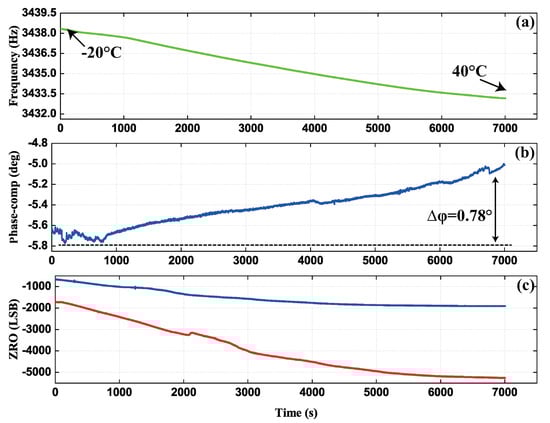 Eventually, the gyroscope and circuits system was placed in the incubator to test the change of the compensation phase and the validity of the compensation scheme with the temperature range from −20 °C to 40 °C. As shown in Figure 18, the driving frequency was collected online to indicate the change of the interior temperature in the gyroscope control system. The maximum variation of the compensation phase is approximately 0.78° as the temperature changes from −20 °C to 40 °C. The variable quantity showed that the phase delay is sensitive to the temperature and online compensation is very necessary. Furthermore, it is significant to find that the variation of ZRO was reduced from 0.009°/s/°C to 0.003°/s/°C after compensation in the full temperature range. Although It also drifted due to the in-phase dampling error, the temperature sensitivity of the ZRO was decreased by three times with better temperature robustness. For one thing, the results confirmed the effect of the compensation program in eliminating the mixture of the quadrature error and depressing the temperature drift of ZRO, which also illustrates that the compensation method could track the fluctuation of the phase delay error online, despite the change of the temperature. It is also important for this method to relieve the influence of environmental temperature on the stability of the gyroscope.