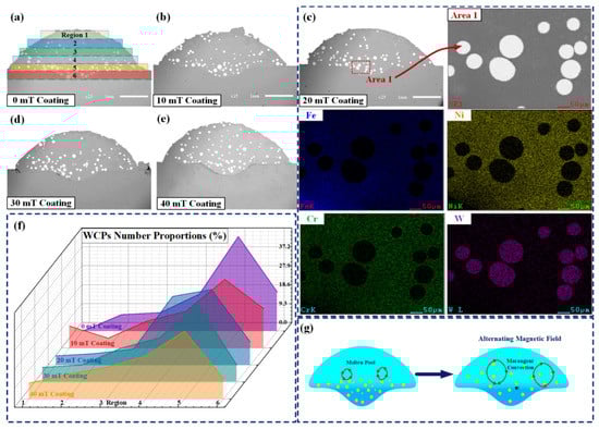 (a) The cross-sectional morphologies of coating of 0 mT; (b) the cross-sectional morphologies of coating of 10 mT; (c) the cross-sectional morphologies and the element map of Cr, Fe, Ni, W of coating of 20 mT; (d) the cross-sectional morphologies of coating of 30 mT; (e) the cross-sectional morphologies of coating of 40 mT; (f) the WCP proportions in particle volume ranges of coatings; (g) schematic diagram of the evolution mechanism of the WCP distribution.