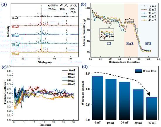 Figure 5b shows the microhardness of cladding layers under different magnetic field intensities. The hardness of each coating is about 750 HV0.2 to 820 HV0.2 on average, which is higher than substrate hardness 210 HV0.2. The microhardness exhibits a salient downward trend because of the large temperature gradient at the top of coating during solidification and the dense structure formed by the rapid crystallization. Therefore, the hardness at the top of the coating is large, reaching 950 HV0.2 [21]. As observed from Figure 5b, in terms of the hardness in the middle of coating, the average coating hardness is the highest when the intensity of alternating magnetic field reaches 40 mT, while the average hardness is the lowest in the absence of the intensity of the alternating magnetic field. Generally, when the magnetic field intensity is higher, the corresponding coating hardness will be elevated as well, and as the intensity of alternating magnetic field reaches 40 mT, the coating will reveal relatively stable variation of hardness. However, there will be significant fluctuations in coating hardness in the absence of the alternating magnetic field. The higher the magnetic field intensity is, the more stable the variation that will occur in coating hardness. The hardness values over the middle of coating are stable, fluctuating less in this area. This is because, on the one hand, with the increasing intensity of the alternating magnetic field, the stirring in the laser pool becomes increasingly prominent. WC particles are more evenly distributed in the laser pool, absorbing more heat, promoting the formation of carbide hard phase in the cladding layer and strengthening the solid solution. On the other hand, WC decomposes when heated and reacts with the surrounding metal solution, promoting the growth of nuclei and accelerating the formation and nucleation of heterogeneous crystals. At the same time, unmelted WC particles can hinder the growth of dendrites and alter the formation of growth [22]. Therefore, with increasingly uniform distribution of WC particles, the grain can be refined to significantly improve the microhardness. The formation of a large number of high-hardness carbides can prominently improve the coating microhardness, which can effectively hinder the growth of dendrites, refine the grains, and strengthen the dispersion. The dispersion strengthening will obtain a better effect when the distribution of WC is more uniform in the coating. WC particles can realize the function of solution strengthening and dispersion strengthening. With growing magnetic field intensity, the WC content in the middle of the coating becomes higher, and the carbide hard phase precipitated in the middle of the coating increases. Furthermore, with the increase in magnetic field intensity, the carbide hard phase is “broken”, forming more and smaller carbide hard phases, and the average microhardness increases to realize dispersion strengthening [23]. Figure 5b shows that coating hardness decreases sharply in the area 1.3~1.7 mm away from the coating surface, because coarse dendrites are mainly concentrated at the bottom of the coating and feature low hardness. However, the area 1.8~2.2 mm away from the coating surface, which refers to the heat-affected zone, shows a rapid increase in hardness. This is because the heat is transmitted to the substrate during laser cladding, resulting in martensite phase transformation and quenching. It is observed that the coating hardness of the heat-affected zone is the highest in the absence of a magnetic field. The hardness of the heat-affected zone decreases with increasing magnetic field intensity. This is because in the absence of a magnetic field, a large number of WC particles precipitate to the bottom area, and many carbon elements penetrate into the substrate, resulting in the high hardness of the heat-affected zone. With the increase in magnetic field intensity, the distribution of WC particles in the middle area increases, the WC particles at the bottom decrease, the carbon elements penetrating into the substrate decrease and the hardness of the heat-affected zone decreases.