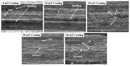 Figure 6 shows the wear morphology of the coating under different magnetic field intensities. In the absence of an alternating magnetic field, the coating surface exhibits severe wear with shallow spalling and deep grooves. This is because most of the WC particles gather at the bottom of coating in the absence of an alternating magnetic field. Due to the uneven distribution of WC particles, the particles may be densely located in a certain area, resulting in ill combination with the coating. Consequently, WC particles may easily spall during the friction process, leading to abrasive wear and grooves on the friction surface. As can be observed from Figure 6, when the magnetic field intensity increases, there are no obvious furrows and large spalling layers, but only some small spalling pits, indicating the decreasing adhesive and abrasive wear [27,28]. This is because with the growing intensity of the alternating magnetic field, the WC particles are uniformly distributed. Therefore, the coating microstructure becomes finer and produces a stronger imbedding force. Additionally, WC particles are less prone to spalling, which reduces the wear. On the other hand, the stirring of the alternating magnetic field on WC particles facilitates the heat absorption in the laser pool, accelerates the decomposition of WC particles, promotes the formation of carbide hard phase in the melt layer, improves the coating hardness and optimizes the wear resistance of the coating simultaneously.