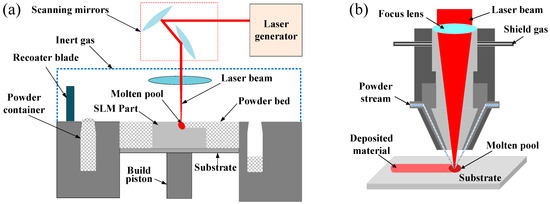 Schematic illustration of (a) powder bed fusion and (b) direct laser deposition LAM.