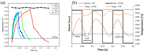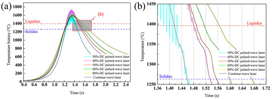 With the comparison of CW laser mode, the study reported by Z. Yang et al., in which the duty cycle was 50%, showed the peak temperature variation in one pulse period with the difference of pulse frequency as shown in Figure 2a. During the LMD process of high-nitrogen steel (HNS), the peak temperature of the melt pool created by CW laser mode was about 2900 °C and remained almost stable. Under the PW laser mode regardless of the pulse frequency, the temperature of molten pool increased dramatically with a gradual decline of growth rate when the laser was ON, and then, decreased dramatically when the laser was OFF. With the increase of pulse frequency from 20 Hz to 80 Hz, the maximum temperature decreased from 2860 °C to 2690 °C and the minimum temperature increased from 1210 °C to 1480 °C. Under the pulse frequency of 60 Hz and 80 Hz, the minimum temperature of molten pool exceeded the solidus temperature (1400 °C) of HNS that meant the molten pool kept continuous during the LMD process. Thus, the fish-scale patterns were not observed on the surface morphology of single-track clad that also proofed by the experiments. The pulse frequency of 60 Hz was the critical value which decided whether the molten pool remained continuous or not [27]. Therefore, the pulse frequency should be larger than the critical value to assure the continuous molten pool.
