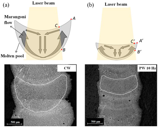 Marangoni flow within the cross-section of the IN718 thin walls when (a) CW and (b) 10 Hz PW laser are used. (Reprinted from ref. [32], copyright (2020), with permission from Elsevier).