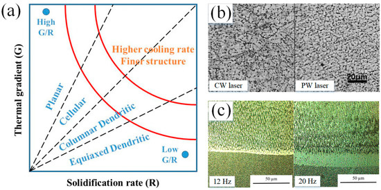 (a) Solidification map established by solidification parameters (Reprinted from ref. [27], copyright (2021), with permission from Elsevier); (b) Optical micrographs of CW and PW laser cladding Fe-based depositions (Reprinted from ref. [25], copyright (2014), with permission from Elsevier); (c) OM images of the intermixing zone of Inconel 713 deposition with a laser frequency of 12 Hz and 20 Hz (Reprinted from ref. [37], copyright (2021), with permission from Elsevier).