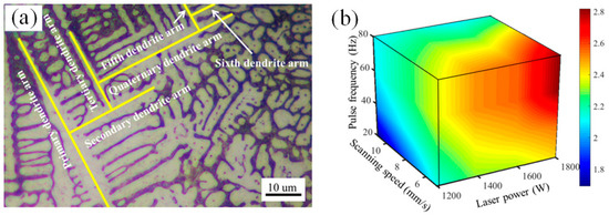 In addition, the secondary dendrite arm spacing (SDAS) was usually chosen as the representation of microstructure evolution. The SDAS values decreased along the direction from bottom to top of the deposition layer due to the different cooling rate in the different region of molten pool. The SDAS would increase with the increase of laser power and reduction of scanning speed because of the increased heat inputting and decreased cooling rate of molten pool. The variation of PW laser parameters exactly affects the heat inputting and the SDAS. Z. Yang et al. pointed out that the SDAS in high-nitrogen steel deposition increased dramatically with the pulse frequency increased from 20 Hz to 60 Hz during the other parameters kept constant. However, during the pulse frequency exceeded to 60 Hz, the effect on SDAS became minimal. An interesting phenomenon was presented that a sixth dendrite arm was observed in the pulsed LAM samples as shown in Figure 6a. It turned out that that as long as there were sufficient spaces and large enough solidification rates, new branches can continuously grow from the primary dendrite arms. In addition, the SDAS value map was plotted as a function of laser power, scanning speed, and pulse frequency as shown in Figure 6b [27].