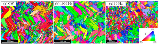 EBSD map of the longitudinal section zx plane during using of (a) CW, (b) PW with the frequency of 1000 Hz and (c) PW with the frequency of 10 Hz (Reprinted from ref. [32], copyright (2020), with permission from Elsevier).