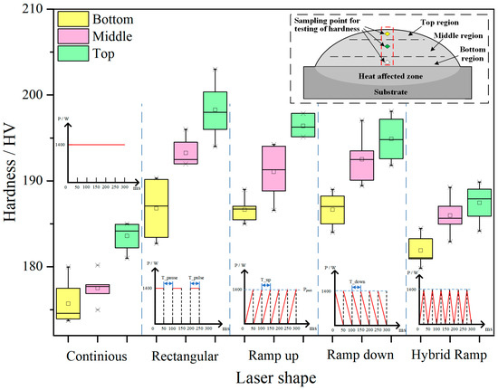 Microhardness at different regions of AISL316L deposition produced by different laser shape. (Reprinted from ref. [29], copyright (2020), with permission from MDPI.).