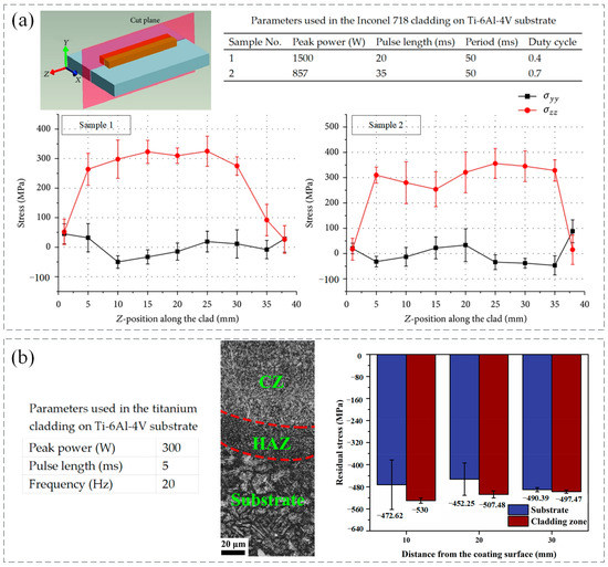 (a) Residual stress of Inconel 718 cladding creased by different parameters of PW laser (Reprinted from ref. [31], copyright (2014), with permission from Hindawi.); (b)Residual stress of substrate and coating zone. (Reprinted from ref. [47], copyright (2021), with permission from Elsevier).