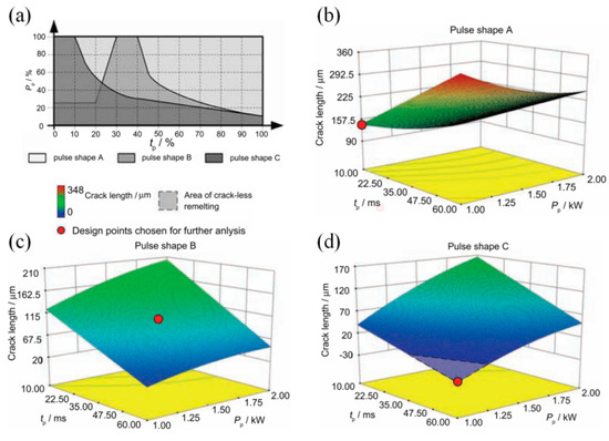 (a) Laser pulse shapes, and the 3-D RSM model plots of crack length in remelted spots during the (b) pulse A, (c) pulse B, and (d) pulse C was used. (Reprinted from ref. [96], copyright (2011), with permission from Elsevier).