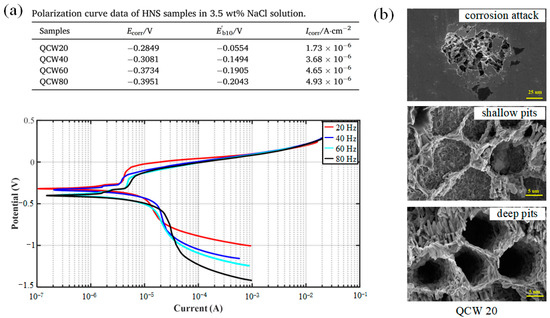 (a) Polarization curves of high-nitrogen steel (HNS) samples under various pulse frequencies, and (b) SEM images (2000×) of the QCW20 sample after the potentiodynamic polarization experiments. (Reprinted from ref. [27], copyright (2021), with permission from Elsevier).