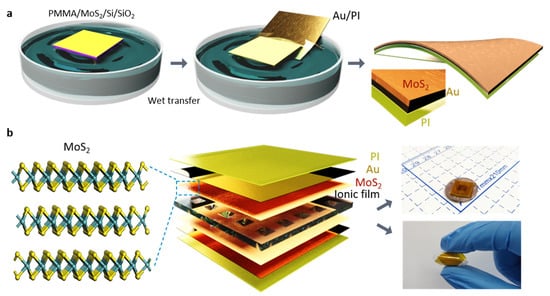 Preparation and schematic diagram of iontronic pressure sensor. (a) Wet transfer process of MoS2 monolayer. (b) Digital optical image and flexible feature of iontronic pressure sensor and the corresponding diagram layout of each layer in the sensor.