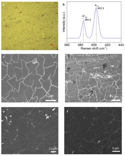 The monolayer MoS2 was transferred onto the Au/PI electrode by wet transfer method [26], and the optical microscope of the electrode is shown in Figure 2a. From which it can be observed that the large and continuous monolayer MoS2 on the Au/PI film showed good integrity and only a very few cracks existed due to etching when the support layer was removed during the transfer process. The Raman results further certified the MoS2 property. The number of layers of the sample can be determined according to the wave number difference between E12g and A1g.from Raman spectra of monolayer MoS2. Wave number difference of bulk material is 26 cm−1, while the wave number difference between A1g and E12g in Figure 2b is 19 cm−1. Hence, the preparative sample of MoS2 can be regarded as monolayer with the thickness of 6.15 Å [27,28]. Further, SEM of the monolayer MoS2 before and after the transfer was performed in Figure 2c,d. It can be observed that the monolayer MoS2 on the Si/SiO2 substrate is large area continuous growth without clear defect. Also, as shown in Figure 2d, the monolayer MoS2 can still be observed as a continuous boundary which is similar to that before transfer to the target substrate by the wet transfer method. This further indicates that the monolayer MoS2 obtained by the wet transfer method has a high integrity with few significant cracks, which lays the foundation for the preparation of the sensor electrode. Finally, SEM of the monolayer MoS2 after 5000 cycle test was performed in Figure 2e,f.
