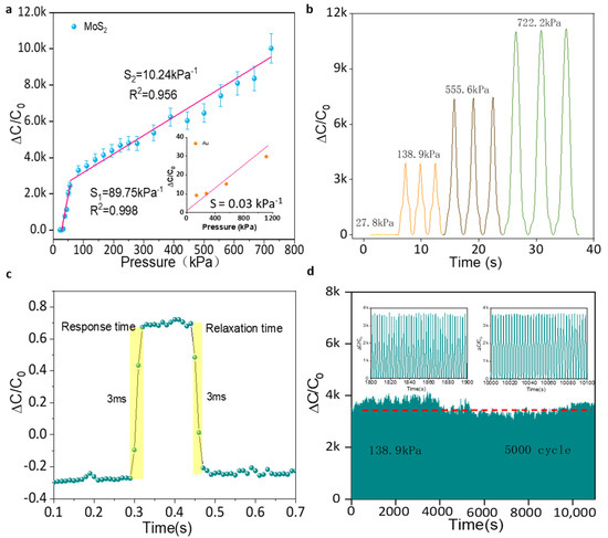 The performance of the sensor is investigated as shown in Figure 4. The maximum sensitivity (Smax) of the MoS2-based iontronic pressure sensor is 89.75 kPa−1 up to 55.6 kPa, and the minimum sensitivity(Smin) is 10.24 kPa−1 in the range of 55.6 kPa to 722.2 kPa, which is superior to our previous work and other works [29,30,31,32,33,34]. Also, an iontronic pressure sensor with the same structure but without the MoS2 layer was prepared as a control group. The results showed that its sensitivity was 0.031 kPa−1, which demonstrated the important role of the MoS2 layer. The increased capacitance is derived from the unique layer structure, huge specific surface area and pseudocapacitance characteristics.