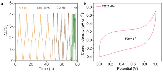 Also, the sensor was further tested at different frequencies (0.1, 0.2 and 1 Hz) at the same pressure (138.9 kPa). As shown in Figure 5a, the sensor maintained a stable signal at various frequency, demonstrating that the sensor’s excellent dynamic response. Importantly, the CV curve of the sensor under 722.2 kPa was investigated to find the deep sensing mechanism. As shown in Figure 5b, the CV curve is not ideally rectangular, and shows a small peak in redox, which is further evidence of the pseudo-capacitance effect as described above.