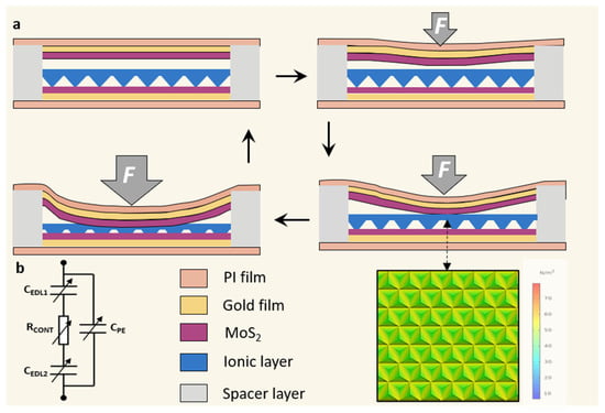 Based on the above, the superior performance of the sensor has been demonstrated and its sensing mechanism was revealed as shown in Figure 6. In this study, in addition to improving the sensitivity by MoS2 layer, a spacer layer is also introduced between the ionic film and the electrode (Figure 6a). Initially, the capacitance is extremely small due to the presence of the spacer layer. When the sensor is subjected to pressure, the upper electrodes layer was bent due to stress and the distance between the two electrodes becomes narrow, resulting in a larger capacitance (CPE, Figure 6b). Further, when the force continues to be applied, the electrodes began contact with the ionic membrane (CEDL1), causing a rapid increase in EDL capacitance. With further increase in force, the contact area between the microstructure of the ionic membrane and the lower electrode further increases and the capacitance further becomes larger (CEDL2), leading to higher capacitance changes. In addition, it is obvious from the simulation that the deformation of the microstructure is mainly concentrated in the middle part of the microstructure rather than the tip of the structure, which may be due to the unique shape of the microstructure. It is also confirmed that the microstructure can improve the capacitance of the sensor.