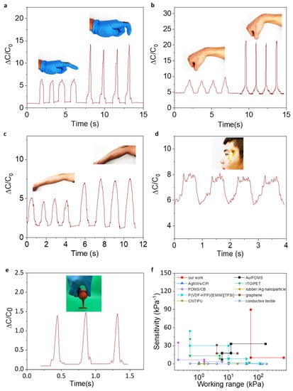 Practical application of the flexible iontronic sensor for montion monitoring. Capacitance variations of the sensor during (a) finger (b) wrist (c) arm bending and (d) eye blinking. (e) Capacitance response output of gas leak monitoring, and the image is shown in the inset. (f) Comparison of the sensitivity of our pressure sensor with existing capacitive sensors.