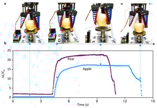 Further, we directly mounted the flexible sensor on the flexible manipulator and use the manipulator to grasp objects of different weights. In this study, pears and apples of different weights but similar shapes for comparison. As shown in Figure 8, the capacitance change trend of both is the similar, but the magnitude is different, which is due to the different magnitude of force applied by the manipulator when grasping two different weight objects. This successfully demonstrates that the prepared sensor has the ability to recognize the weight of the target and can be used as a tactile sensor to fix on the flexible manipulator to recognize the mass of the object.