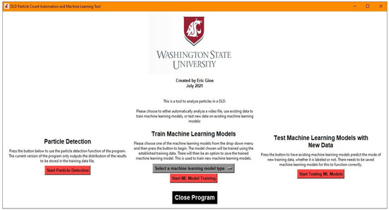 It was decided to create an all-inclusive executable that contained all of the resources for the program to avoid the user managing proper installations of Python and the appropriate packages and versions. To do this in a clean manner, a graphics user interface (GUI) was created using Tkinter, a native Python package. An example of the main menu GUI can be seen in Figure 2. The three major functions available for use are particle detection, machine learning model training, and testing existing machine learning models with new data. The particle detection functionality is the basis for the machine learning model training, since it is used to create a dataset that can be labeled for use in model training. Once an acceptable model is saved, it can be tested later on new data, but this will not be discussed in detail due to the similarity to the testing that is completed in the process of training machine learning models.